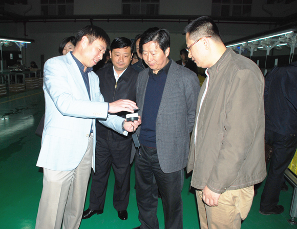 仇平貴聽取公司董事長梅祖軍(左1)LED照明產(chǎn)品的匯報。
